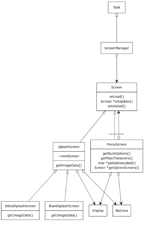 La única pantalla que tiene el juego está gestionada por la clase TanksMainScreen (en la carpeta games/tanksfp). El dibujado de la escena 3D se realiza en el centro de la pantalla (64x64 pixels). Las zonas de los lados se utilizan para indicar cuantos items o enemigos quedan por abatir en el nivel actual y el número del nivel.