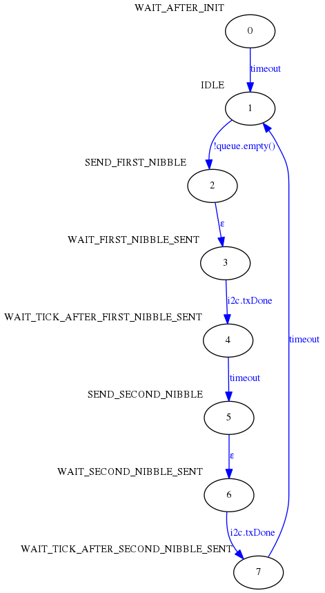 La solución ideal pasaría por una implementación basada en colas y en interrupciones. En este caso se ha implementado una máquina de estados que controla el flujo de datos I2C, el troceado de los bytes en dos nibbles y las esperas que hay que realizar entre un envío y el siguiente. Grosso modo, la solución sería la siguiente: