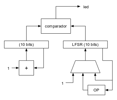 El valor de intensidad lo generaremos mediante un LFSR maximal de 10 bits. Dicho LFSR ha sido utilizado en otros montajes anteriores: