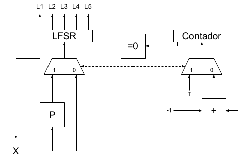 A partir de ahora, como el registro contador contiene un valor diferente de 0, la salida del bloque "=0" será un 0 por lo que el multiplexor del registro LFSR mantendrá el valor actual del registro LFSR y el multiplexor del contador seleccionará la entrada que proviene del sumador. Esta condición se mantendrá durante el tiempo que el contador sea mayor que cero (para T = 50000000 a 50 MHz, tenemos un segundo de tiempo) y en el momento que el contador llegue a cero, el bloque combinacional "=0" emitirá de nuevo un uno y el proceso se reanudará de nuevo (carga del LFSR con el siguiente valor de la secuencia pseudoaleatoria y carga del contador con el valor T).