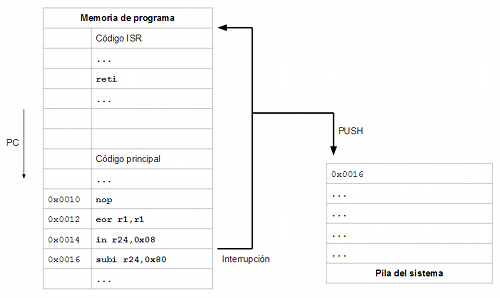 En el momento que se produce la interrupción (la causa puede ser externa al procesador: entradas de datos, pines de entrada que cambian de estado o interna: división entre cero, instrucción no reconocida, etc.) el procesador almacena en la pila del sistema la dirección de la siguiente instrucción que se va a ejecutar y hace que el contador de programa apunte a la primera instrucción del código de interrupción. Este código de interrupción que se ejecuta a raiz del evento suele denominarse ISR (Interrupt Service Routine).